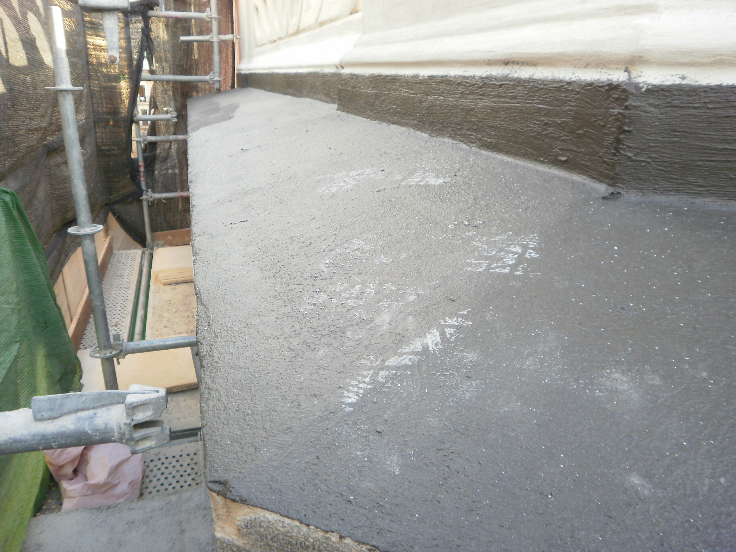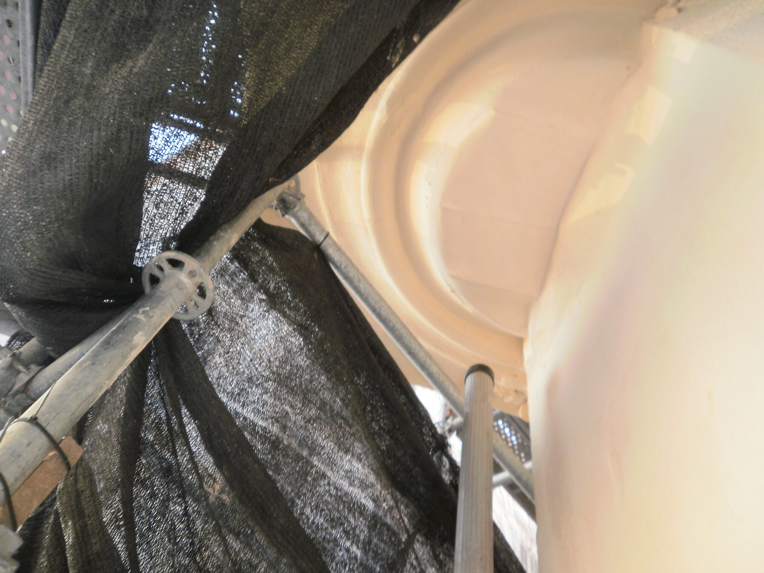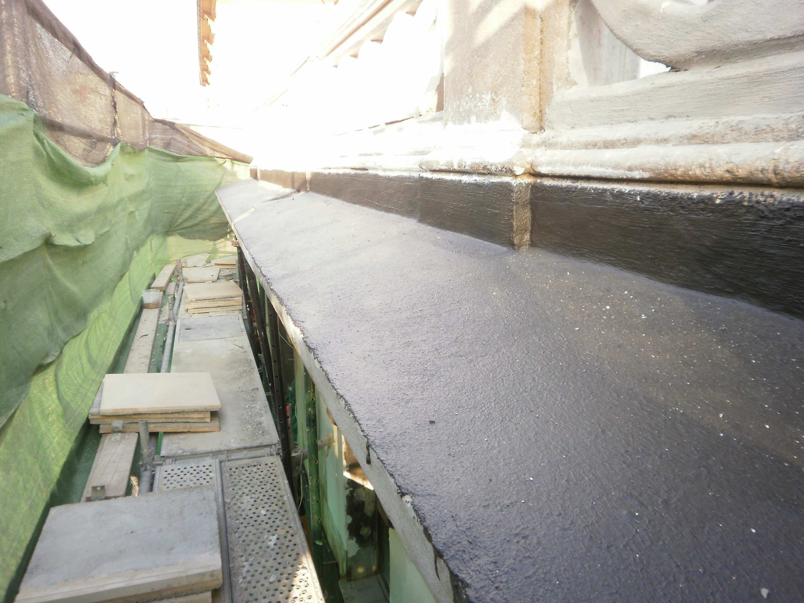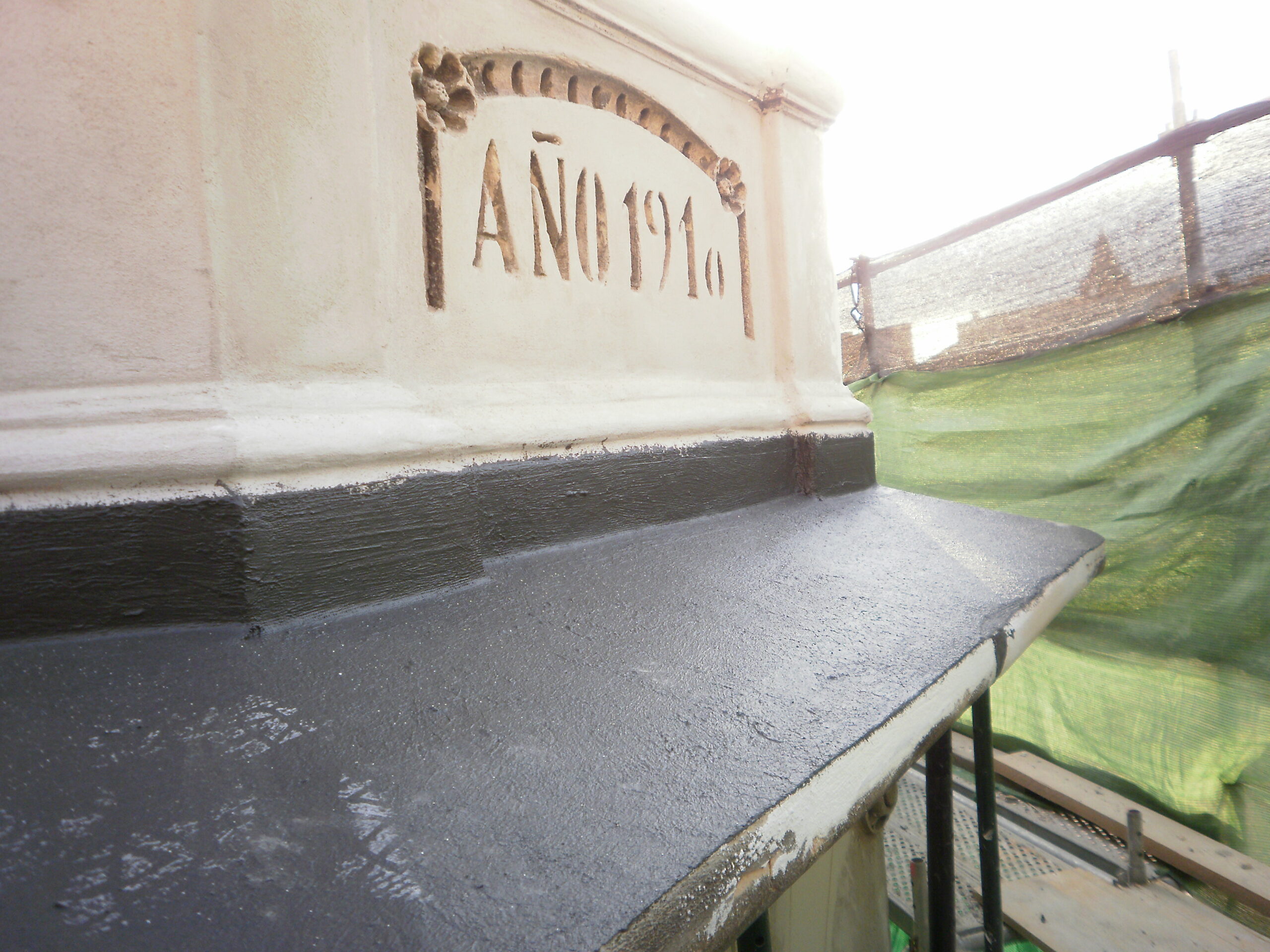 Limpieza de moldura y aplicación de jabón de potasio para usar tramo de maestra para colocación en tramos que faltaban. Se veían las huellas marcadas de los yeseros que hicieron las molduras originales.